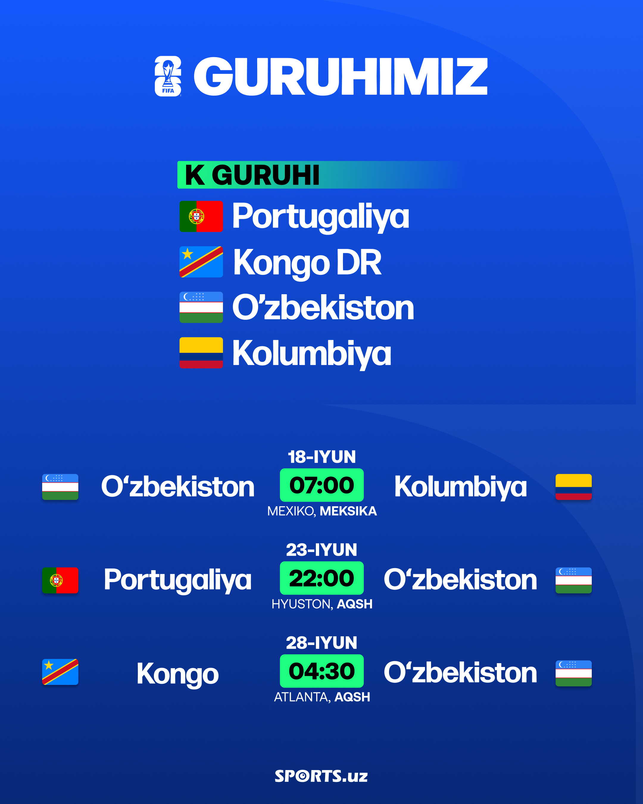 Шу тариқа, гуруҳ босқичида Ўзбекистон, Колумбия, Конго ва Португалия терма жамоалари ўзаро баҳс олиб боради. Фабио Каннаваро шогирдлари илк турни 18 июнь куни Колумбияга қарши ўтказади. Кейинги турда эса Португалия билан куч синашади.
