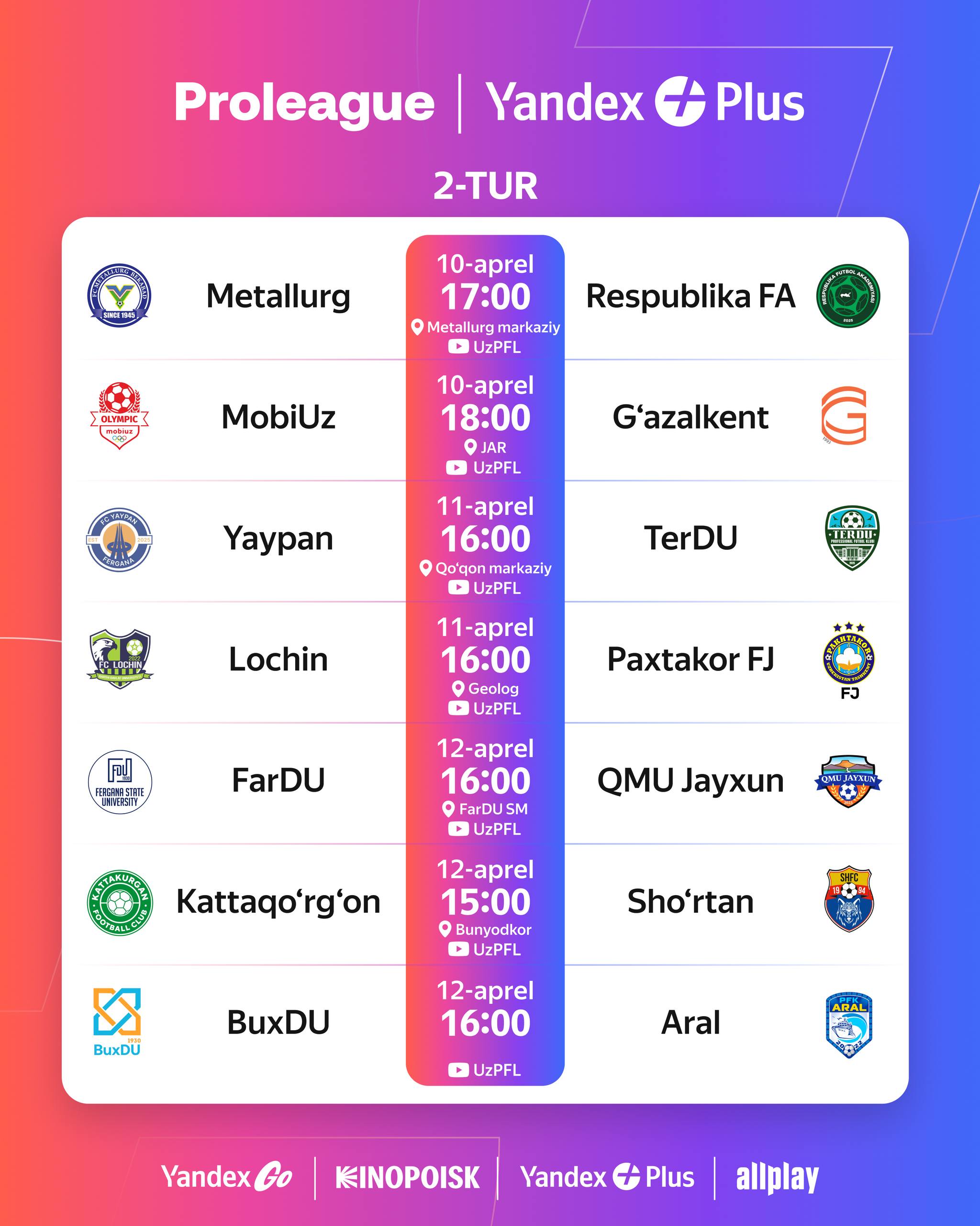 Pro liganing 2-tur juftliklari va boshlanish vaqti bilan tanishing
