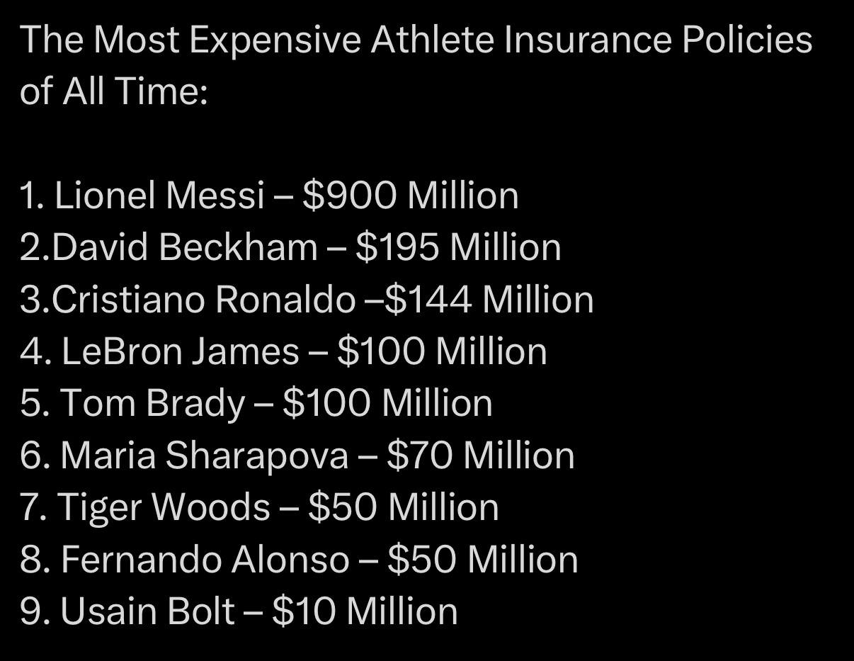 Бу масалада "Барселона" афсонаси Лионель Месси етакчи бўлиб турибди. Унинг хаёти 900 миллион еврога суғурталанган. Иккинчи ўринни эса МЮ афсоналаридан бири Дэвид Бекхэм эгаллаган у ўзини 195 миллион еврога суғурта қилдирган. 3- ўрин эса Криштиану Роналдуга насиб этган.Унинг бу масаладаги нарҳи 144 миллион еврони ташкил этади.