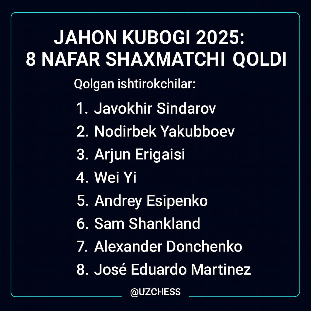Мусобақа айни дамда қизғин палласига кирди. Ҳозирда 8 нафар шахматчи пойгада қолди. Қувонарлиси улардан 2 нафари ўзбекистонлик шахматчилар.