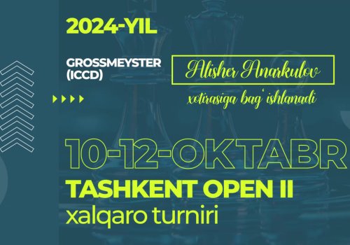 10-12 октябрь кунлари пойтахтимиздаги Ижтимоий инспекция биносида Карлар ва заиф эшитувчилар орасида карлар орасида ўзбекистонлик биринчи гроссмейстер Алишер Анаркулов хотирасига бағишланган Tashkent Open II халқаро турнири бўлиб ўтади.