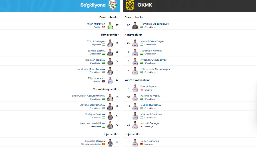 В 21-м туре Суперлиги "Согдиана" примет АГМК. Стартовые составы команд представлены ниже.