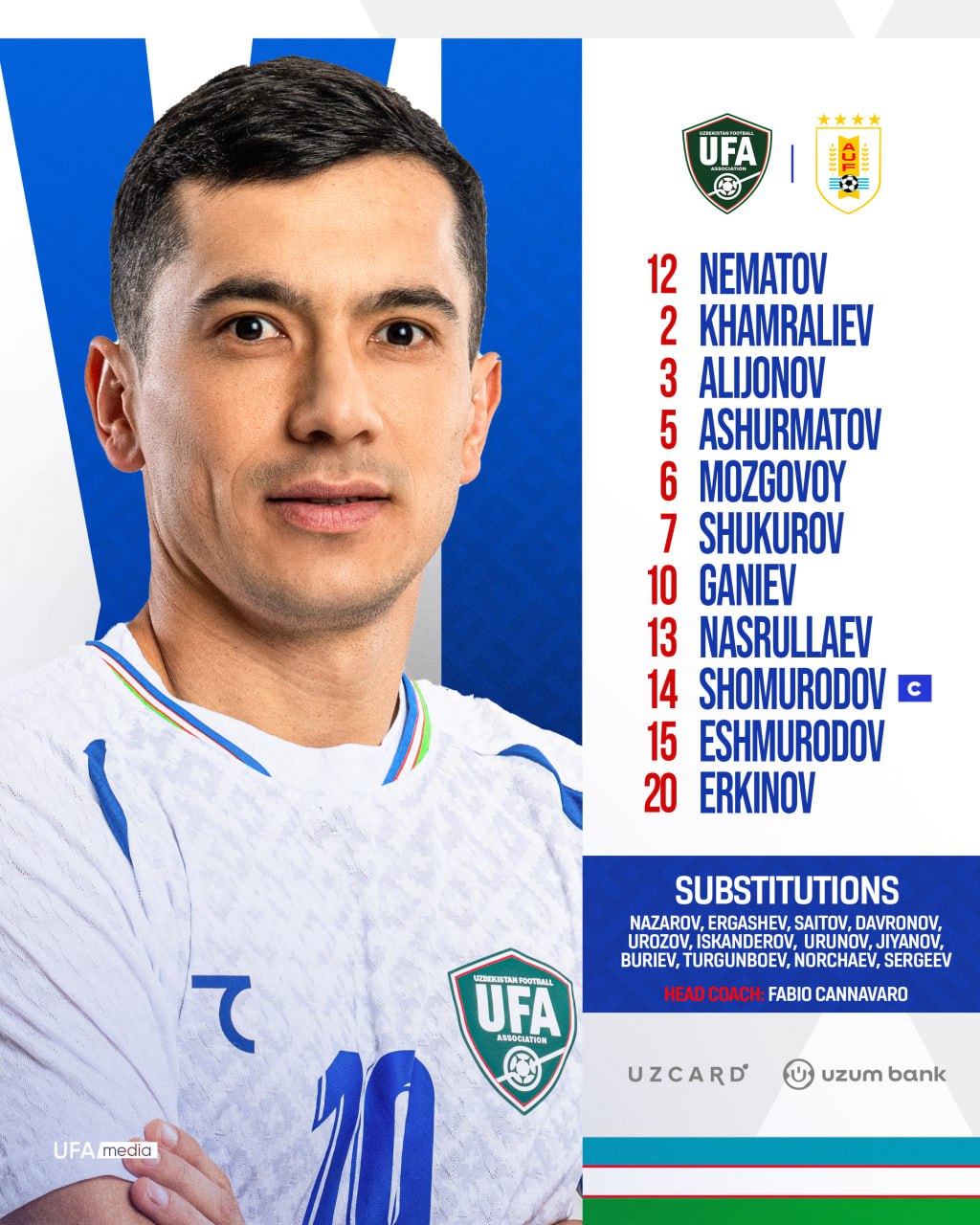 Национальная сборная Узбекистана сегодня в 17:45 сыграет против Уругвая. Стартовый состав нашей сборной представлен ниже.