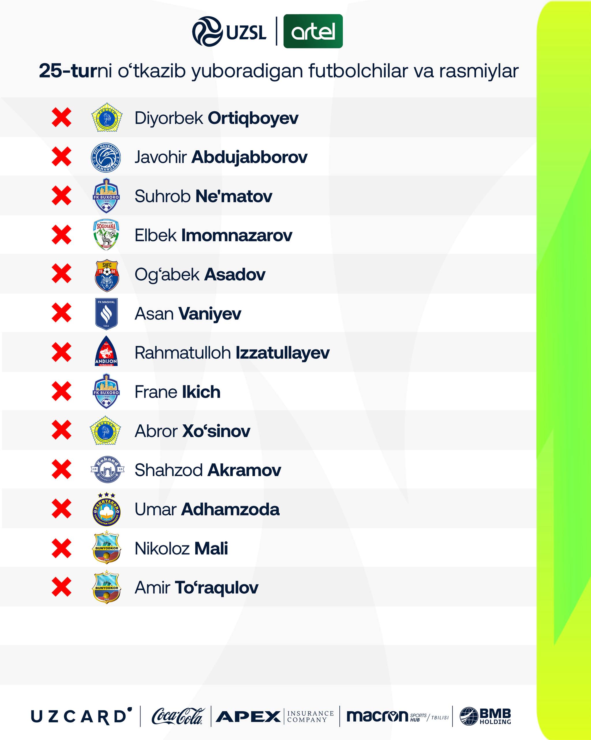 Хабарингиз бор, бугундан Суперлига 25-тур учрашувлари старт олади. Турни очиб берувчи беллашув Қаршида "Насаф" ва "Қўқон-1912" ўртасида кечади.