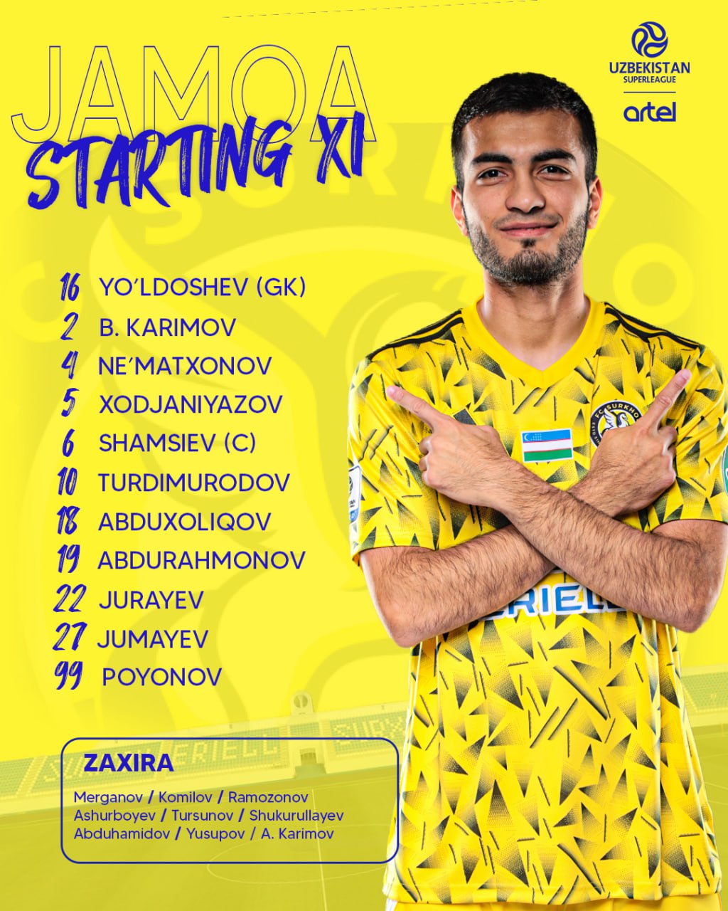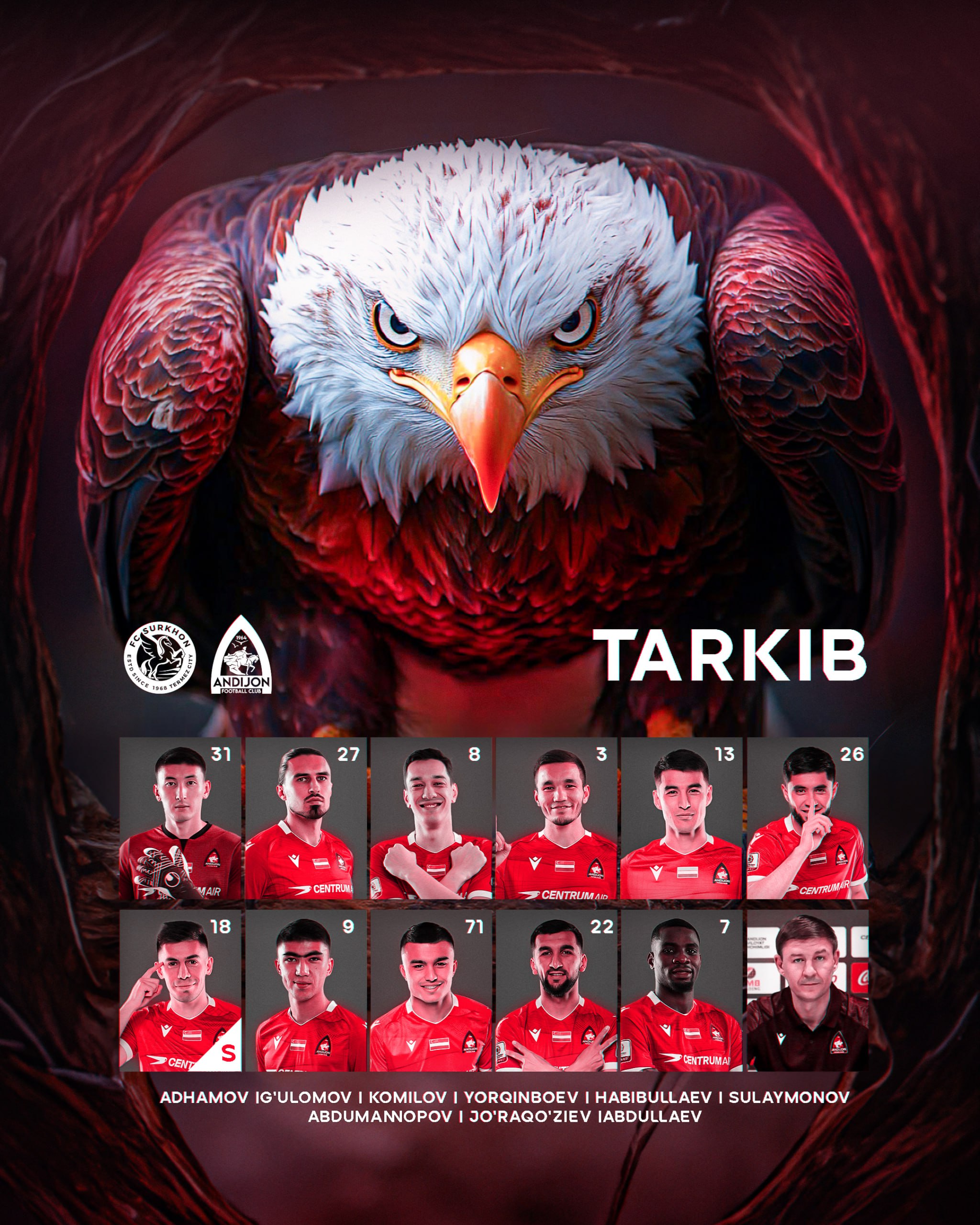 Ўзбекистон Суперлигасининг 26-туридан ўрин олган “Сурхон” ва “Андижон” жамоалари ўртасидаги учрашув бироздан сўнг бошланади. Қуйида икки клубнинг ушбу баҳс учун эълон қилган асосий таркиби билан танишинг.
