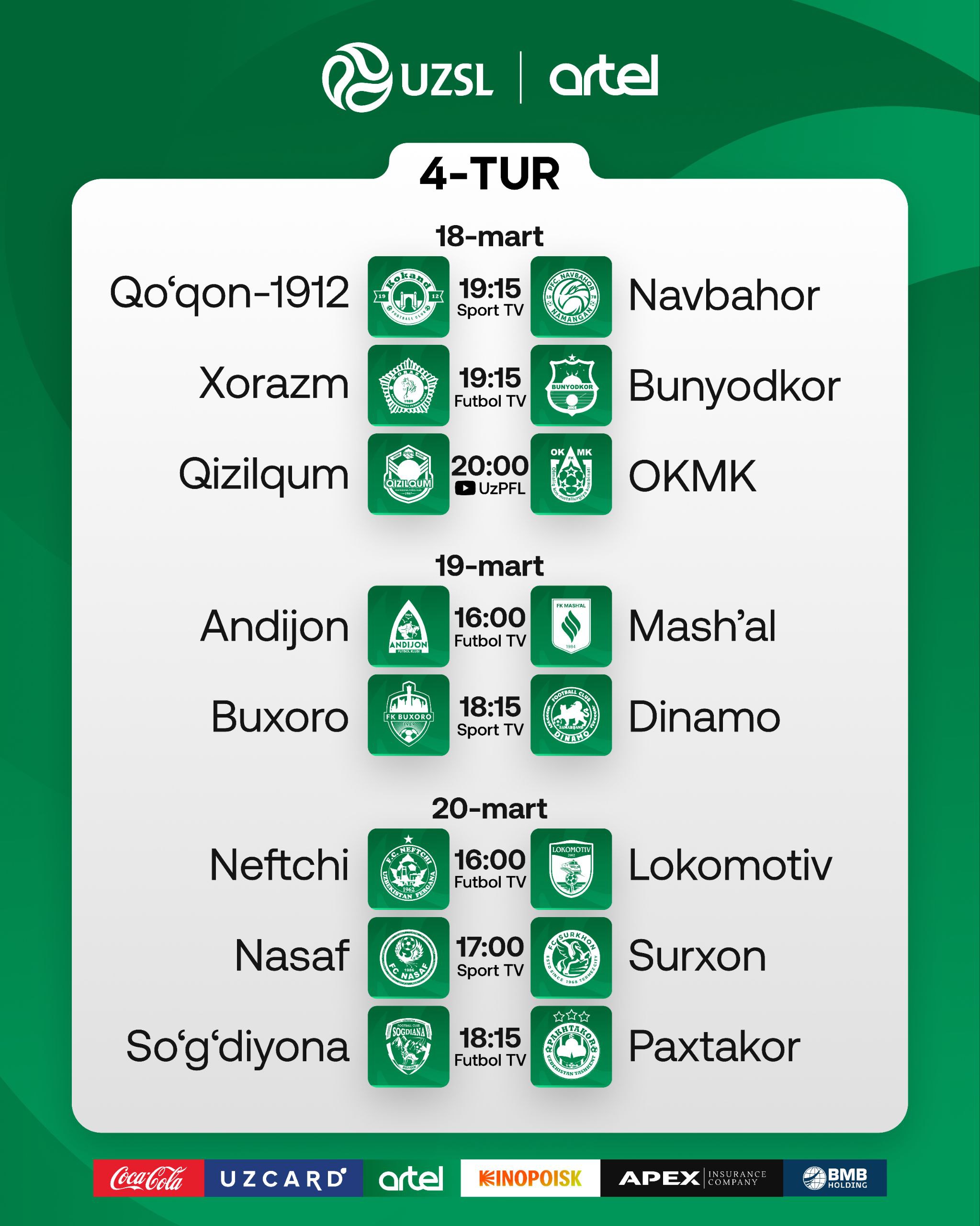 Ўзбекистон Суперлигасининг 4-тури эса 18 март куни "Қўқон-1912" - "Навбаҳор" иштирокидаги баҳс билан старт олади. Тур 20 март куни "Сўғдиёна" - "Пахтакор" иштирокидаги беллашув билан якунланади. Барча тўқнашувларнинг бошланиш вақти билан танишинг.