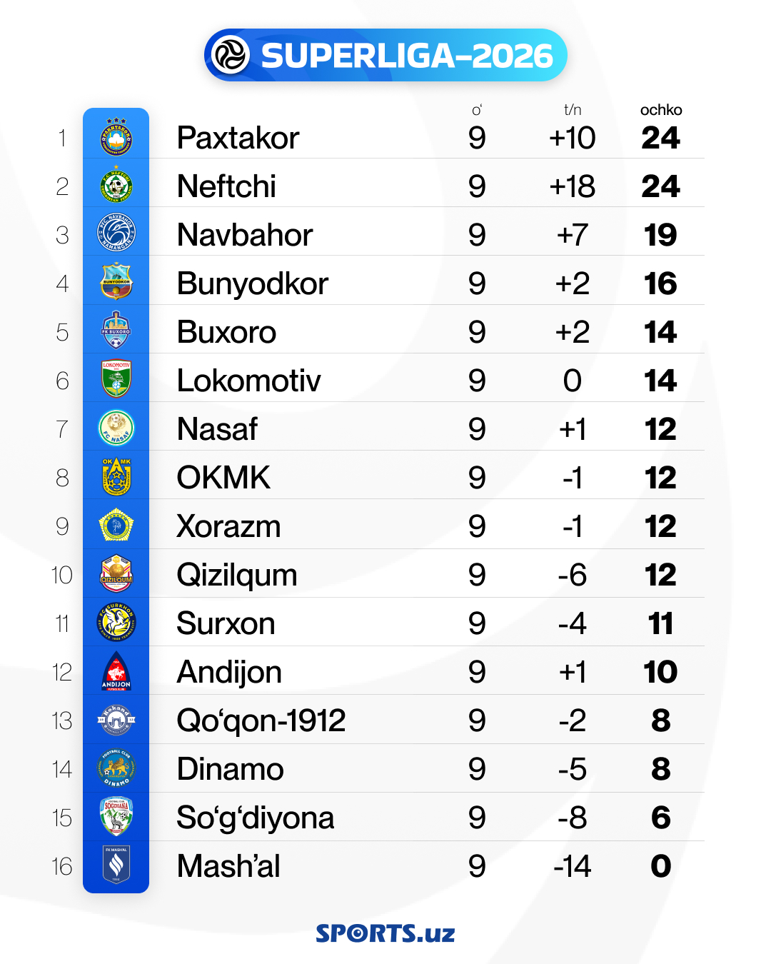 Суперлига. 9-турдан сўнг турнир жадвалидаги ҳолат билан танишинг
