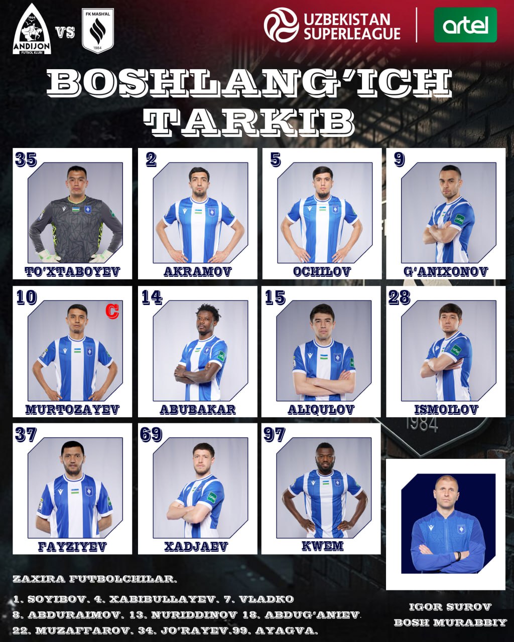 Суперлиганинг 4-туридан ўрин олган "Андижон" - "Машъал" клублари иштирокидаги тўқнашув бошланиш арафасида. Мазкур учрашув учун икки жамоанинг бошланғич таркиблари эълон қилинди.
