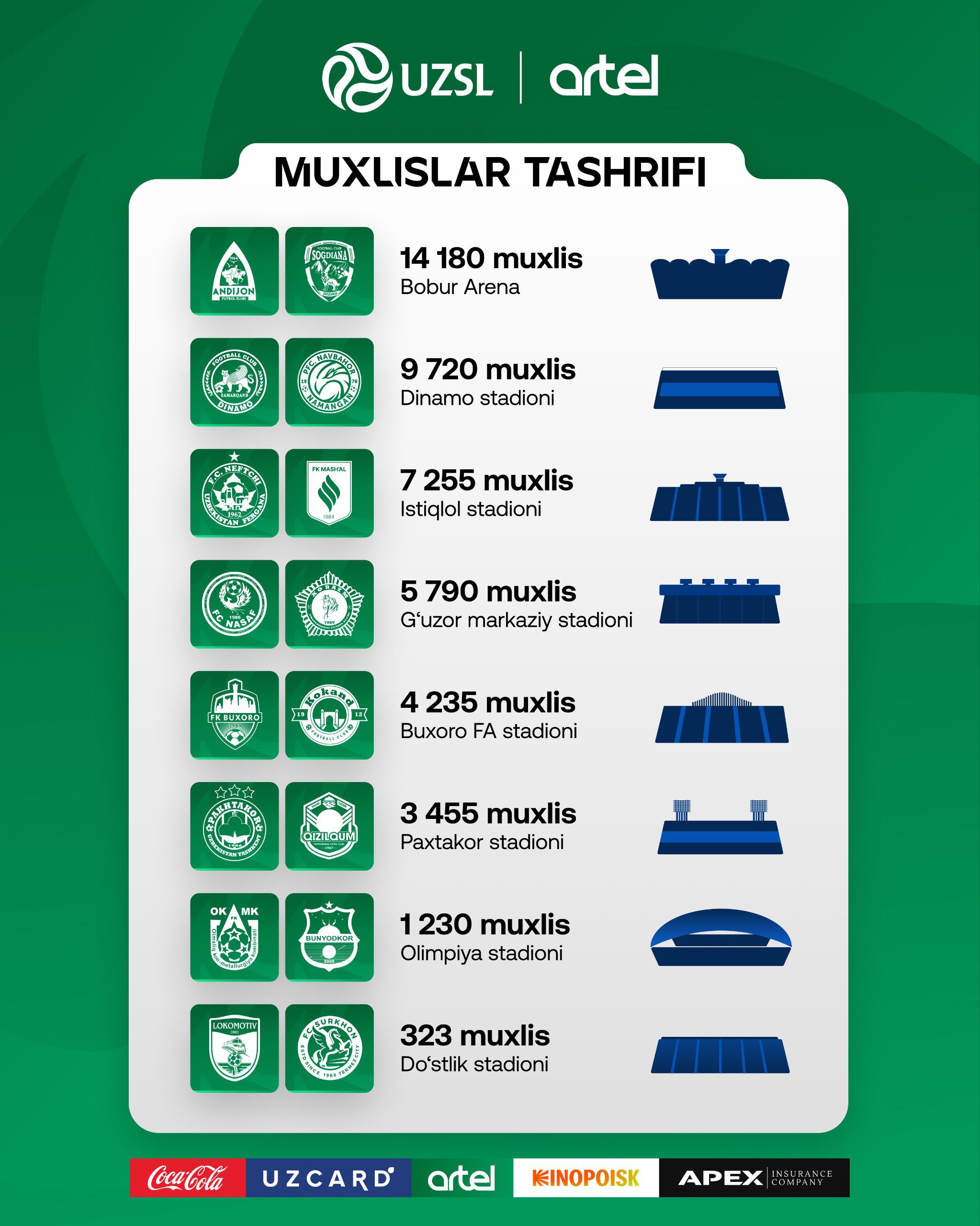 Энг кам ишқибоз эса "Локомотив" - "Сурхон" учрашувида кузатилган бўлиб, ўйинни бор-йўғи 323 мухлис томоша қилган, холос.