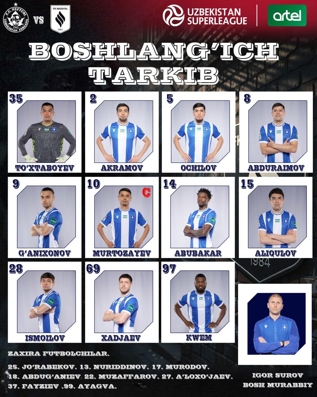 Суперлиганинг 1-туридан ўрин олган “Нефтчи” ҳамда “Машъал” жамоалари ўртасидаги учрашув бошланиш арафасида. Ушбу беллашув олдидан иккала клубнинг бошланғич таркиблари билан танишинг.