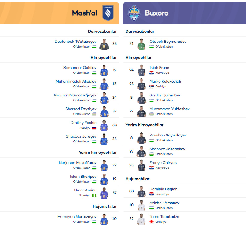 Суперлиганинг плей-офф ўйинлари доирасида "Машъал" — "Бухоро" учрашуви бошланиш арафасида. Мазкур баҳс учун жамоаларнинг асосий таркиблари билан танишинг.