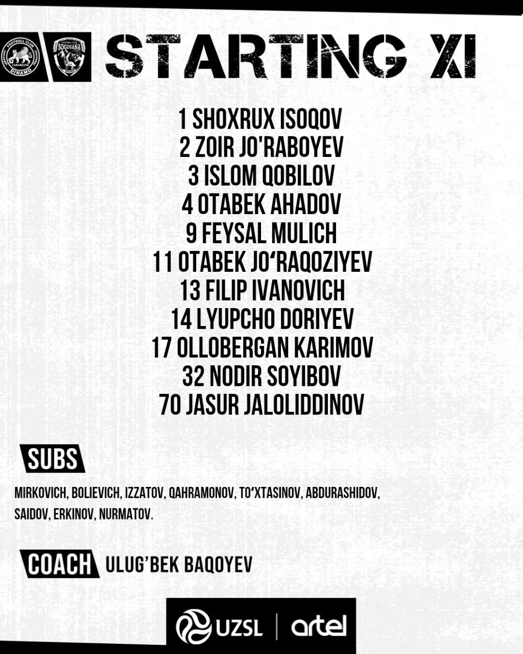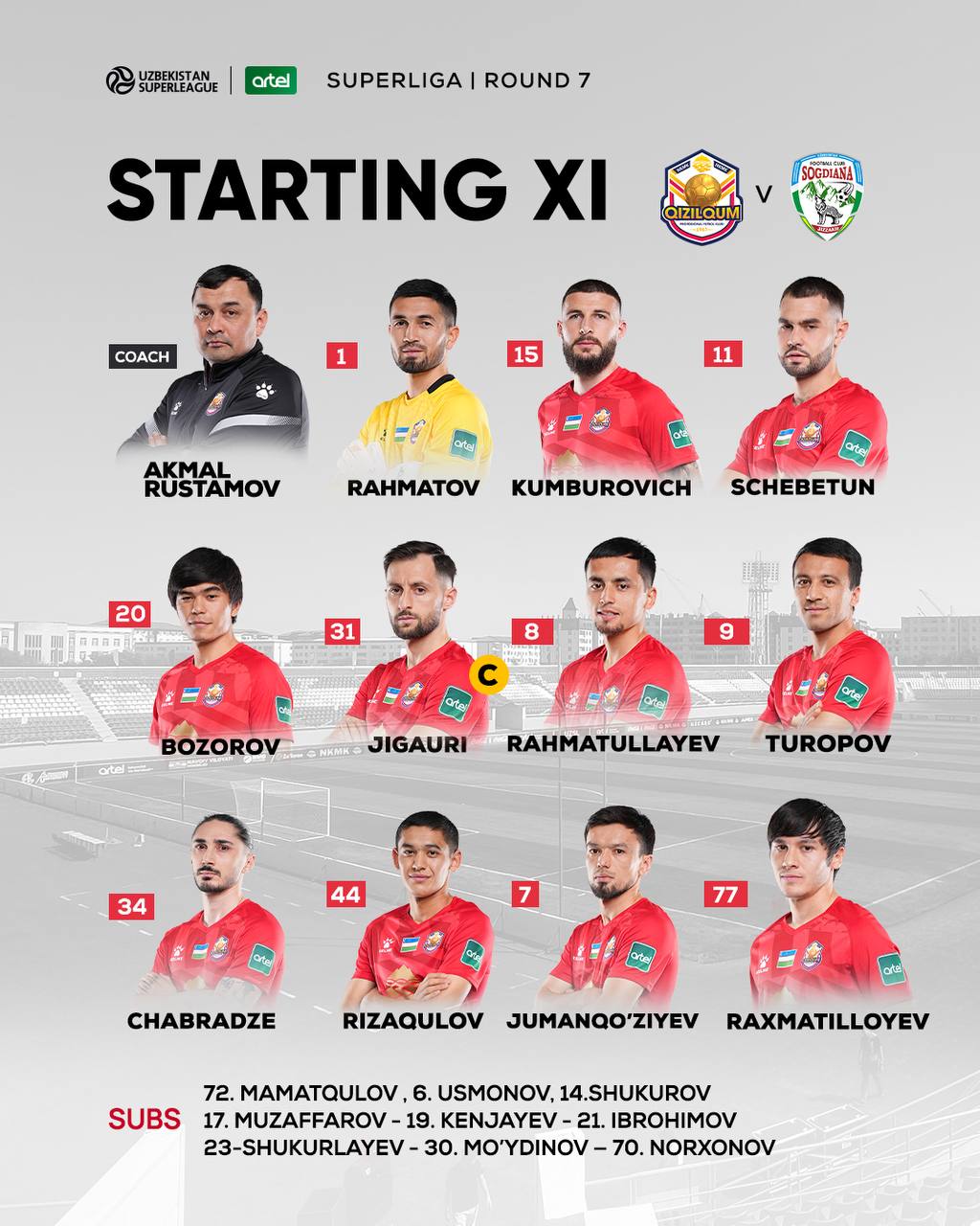Superliganing 7-turidan o‘rin olgan “Qizilqum” va “So‘gdiyona” jamoalari o‘rtasidagi uchrashuvi bir necha soatlardan so‘ng start oladi. Ushbu bellashuv oldidan ikkala klubning asosiy tarkiblari e’lon qilindi.