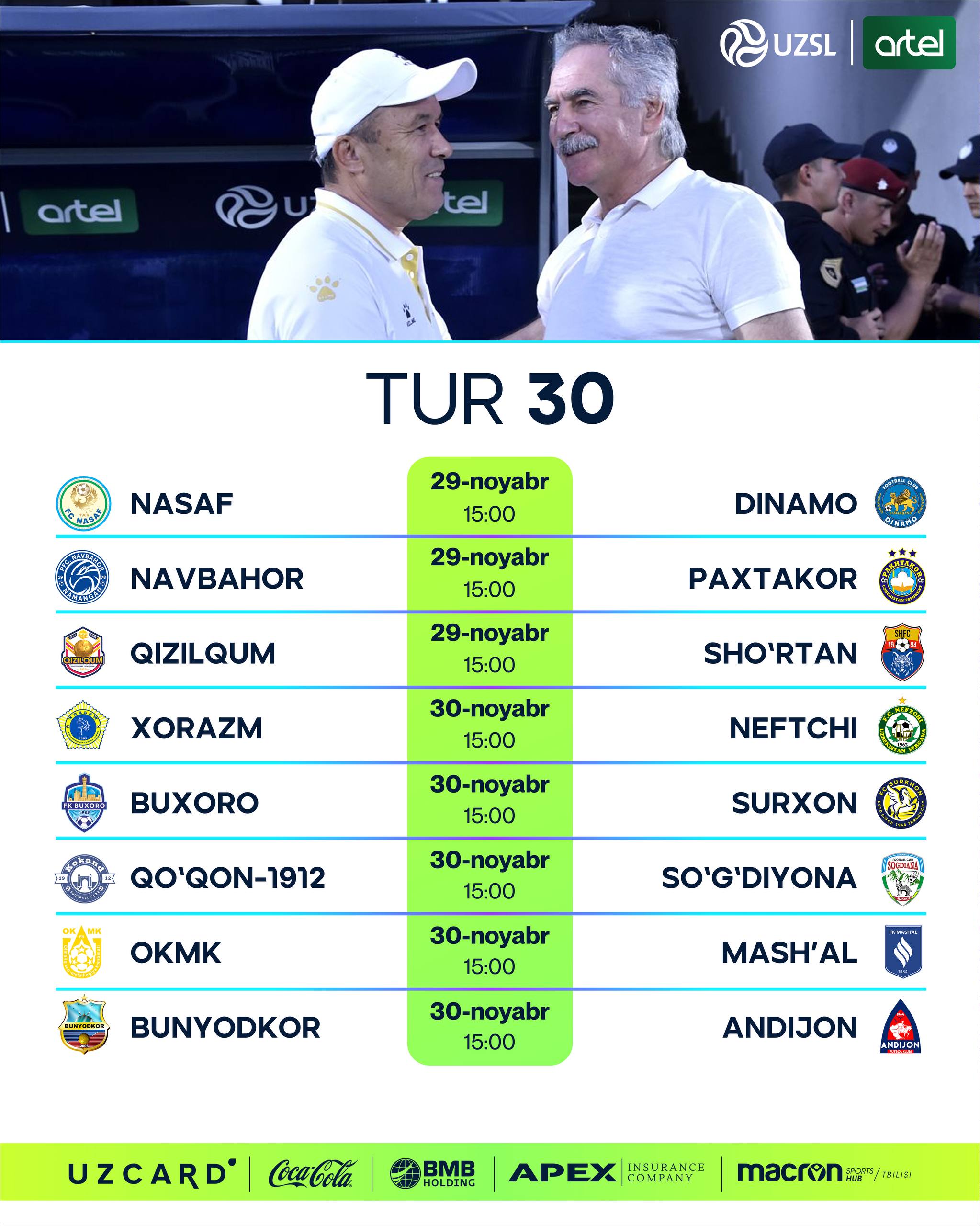 Суперлиганинг жорий мавсуми якунланишига 1 тур қолди. Фарғонанинг "Нефтчи" клуби ўтган турда ўз уйида "Қизилқум"ни мағлубиятга учратиб, муддатидан аввал чемпионликни расмийлаштирди. Қуйида 30-тур учрашувлари рўйхати билан танишинг.