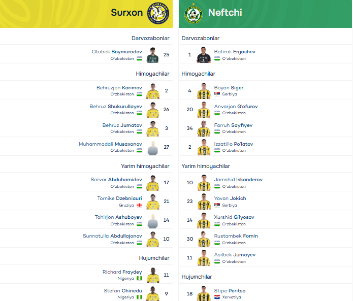 Суперлига. “Сурхон” - “Нефтчи” учрашуви учун жамоаларнинг асосий таркиблари маълум