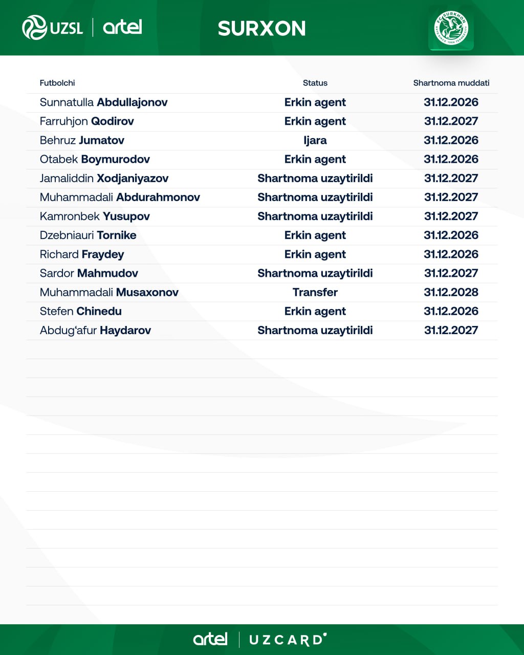 "Сурхон" клуби Суперлиганинг янги мавсуми олдидан таркибини кучайтиришда давом этмоқда. Жамоа 13 нафар футболчини лигада рўйхатдан ўтказгани маълум қилинди.