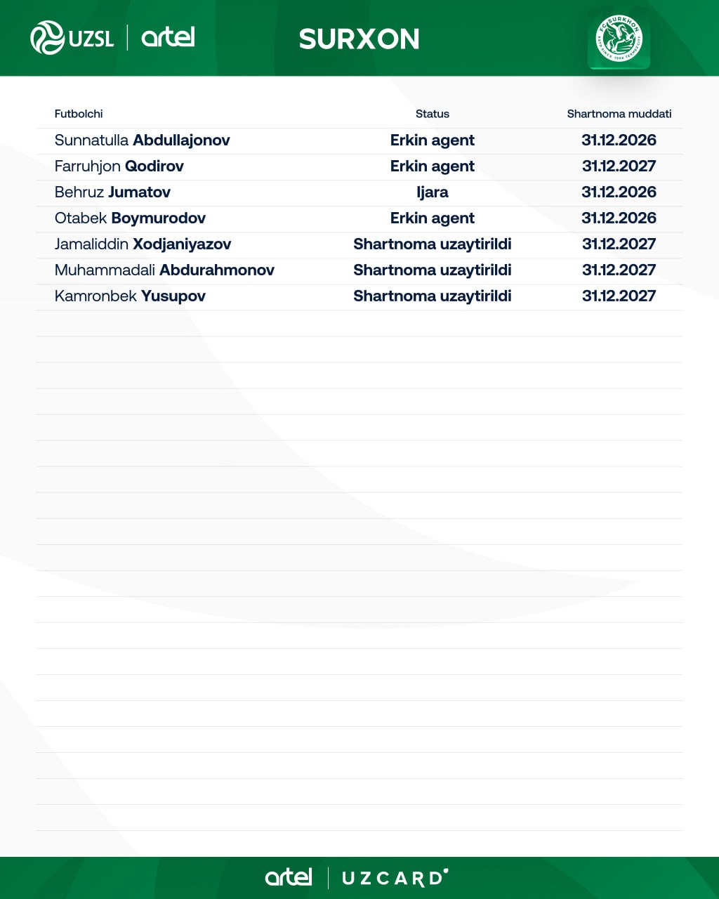 Янги мавсумда ўз олдига катта мақсадлар қўйган Термизнинг “Сурхон” клуби 7 нафар футболчини Лигада рўйхатдан ўтказди. 3 та футболчи билан шартнома узайтирилган бўлса, яна 3 нафари эркин агент мақомида “учар тулпорлар” сафига келиб қўшилди. Битта футболчи эса 1 мавсумга ижарага олинган.