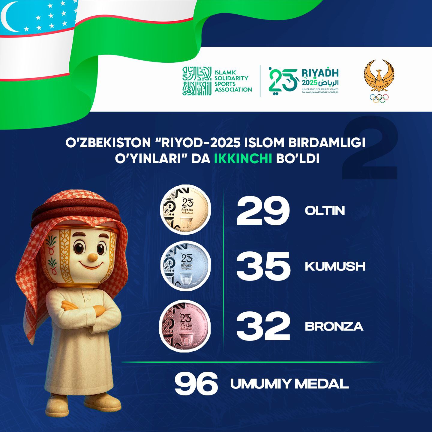 Эслатиб ўтамиз, Риёд-2025 Ўйинларида Ўзбекистон делегацияси 29 та олтин, 35 та кумуш ва 32 та бронза медали билан умумжамоа ҳисобида иккинчи ўринни эгаллади.