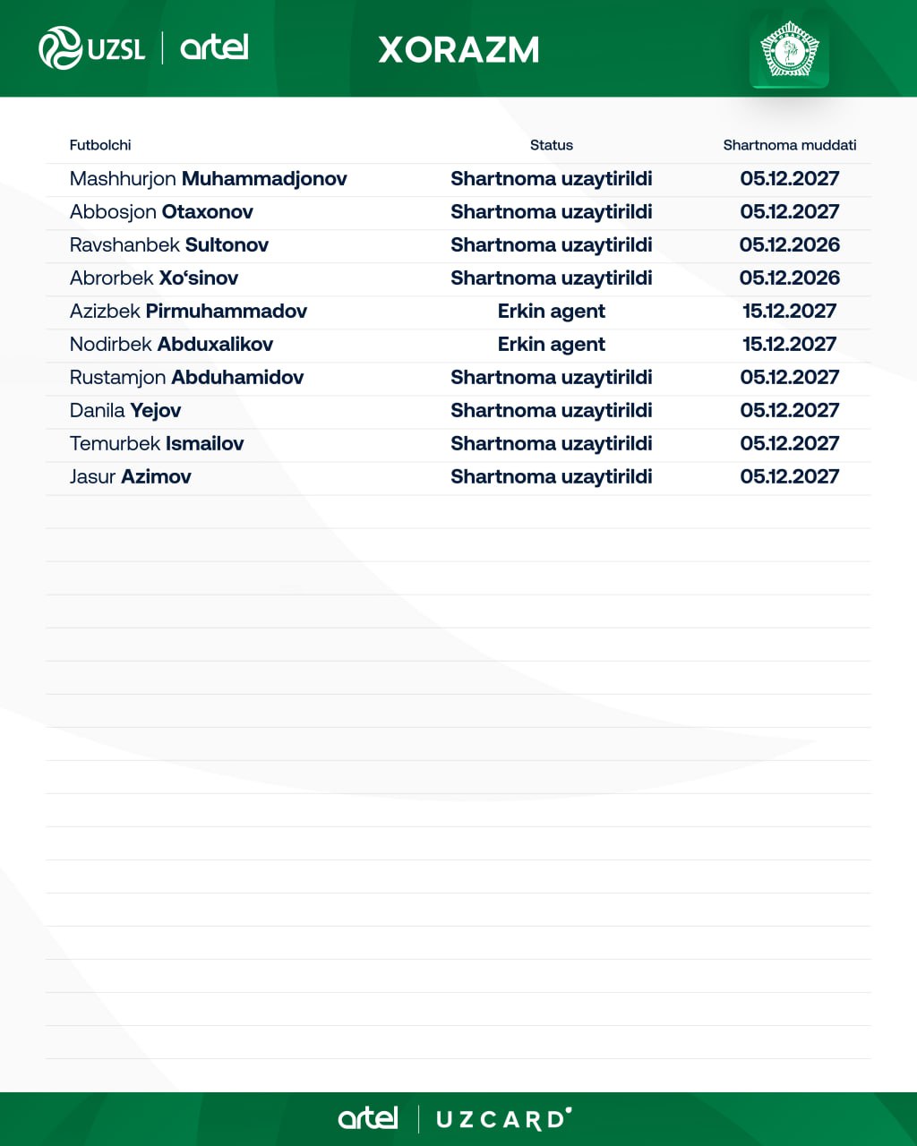 Янги мавсумга жиддий тайёргарлик кўраётган урганчликлар 10 нафар футболчини Лига рўйхатдан ўтказганини маълум қилди. 2 нафар футболчи эркин агент сифатида жамоа сафига келиб қўшилган бўлса, 8 нафар ўйинчи билан шартнома узайтирилди.