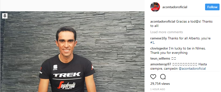 Ispaniyalik mashhur velopoygachi Alberto Kontador Vuelta ko‘p kunlik poygalaridan so‘ng faoliyatini yakunlaydigan bo‘ldi. Ayni paytda Trek-Segafredo jamoasi sharafini himoya qilayotgan 34 yoshli sportchi bu haqda o‘zining instagramdagi sahifasi orqali ma’lum qilgan.