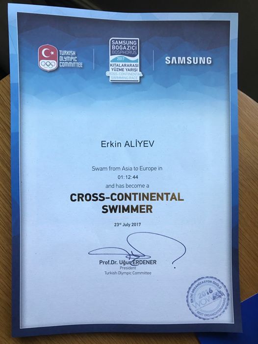 O‘zbekistonlik suzuvchi Erkin Aliev Turkiyaning Bosfor bo‘g‘ozini suzib o‘tdi. Bu haqda suzuvchi o‘zining feysbukdagi sahifasida ma’lum qilgan.