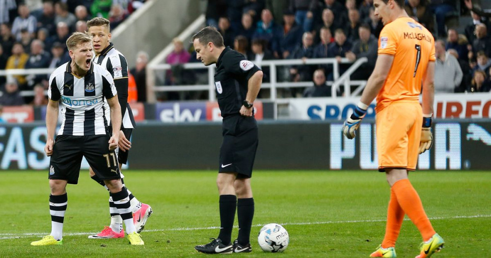 Ushbu o‘yinning 29-daqiqasida bosh hakam “Berton” darvozasi tomon penalti belgiladi. 11 metrli jarima zarbasini esa “qarg‘alar” hujumchisi – Mett Ritchi aniq amalga oshirdi. Bu vaziyatda esa ”qarg‘alar” futbolchisi Duayt Geyl jarima zarbasi amalga oshirilmasidan biroz oldin jarima maydoni tomon talpingani uchun hakam golni bekor qildi. Straud janoblari esa yordamchilari bilan nimalarnidir maslahat qilib, penaltini bekor qildi va “Berton” foydasiga erkin zarba belgiladi.