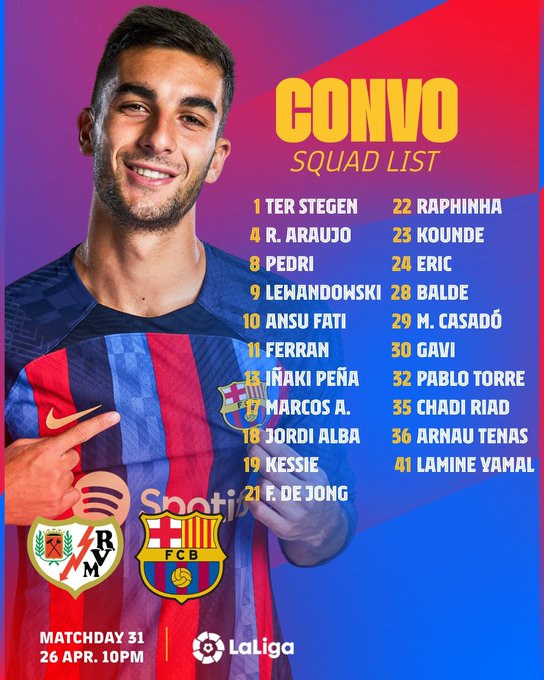 Ispaniya La Ligasining 31-turidan o‘rin olgan "Rayo Valekano" - "Barselona" uchrashuvi uchun "ko‘k-anorranglilar"ning kengaytirilgan tarkibi e’lon qilindi. Jamoa ustozi Xavi Ernandes quyidagi futbolchilarni mazkur ro‘yxatga kiritdi. Marhamat tanishing.