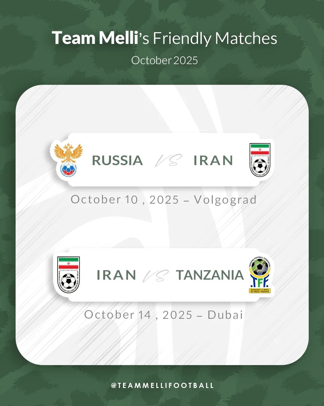 Eron terma jamoasi oktyabr oyidagi FIFA kunlarida Rossiya va Tanzaniya terma jamoalari bilan o‘rtoqlik o‘yinlari o‘tkazadi.