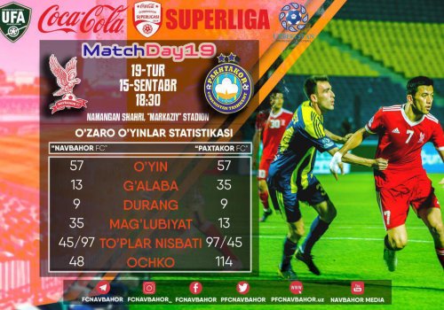 Superliga 19-turi doirasida "Navbahor" jamoasi o‘z maydonida Toshkentning “Paxtakor” klubini qabul qiladi. "Navbahor" klubi matbuot xizmati uchrashuvga oid ma’lumotlarni taqdim etdi.