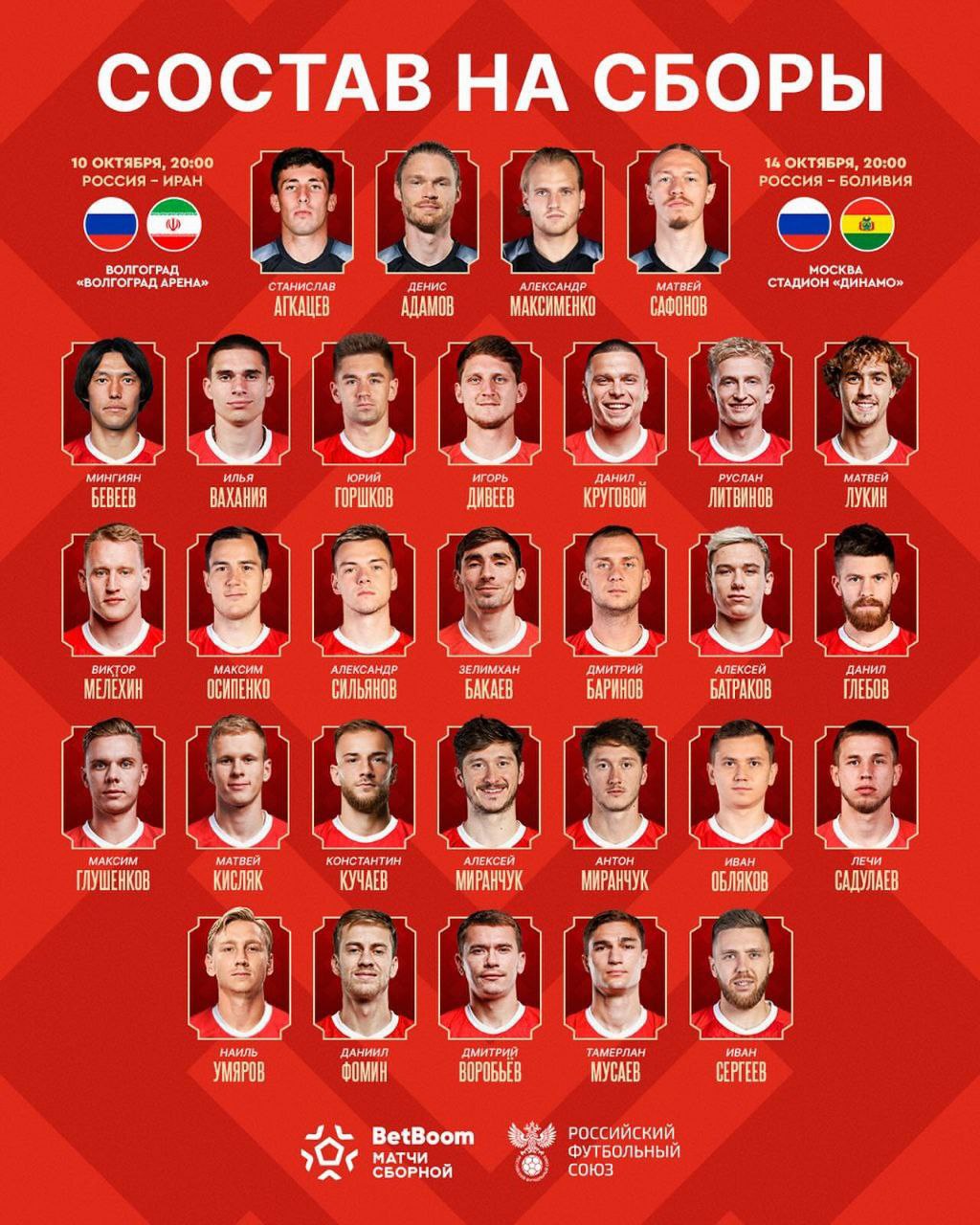 Rossiya terma jamoasining Eron va Boliviyaga qarshi o‘yinlar uchun qaydnomasi ma’lum