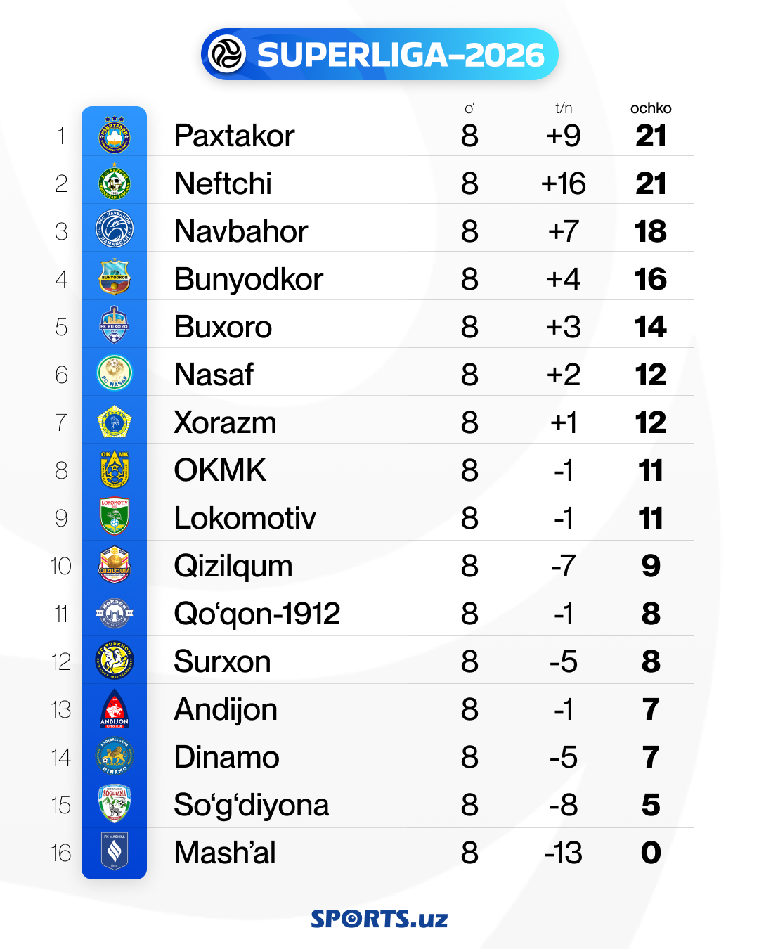 Superliga. 8-tur yakunlandi. Turnir jadvalidagi holat bilan tanishing