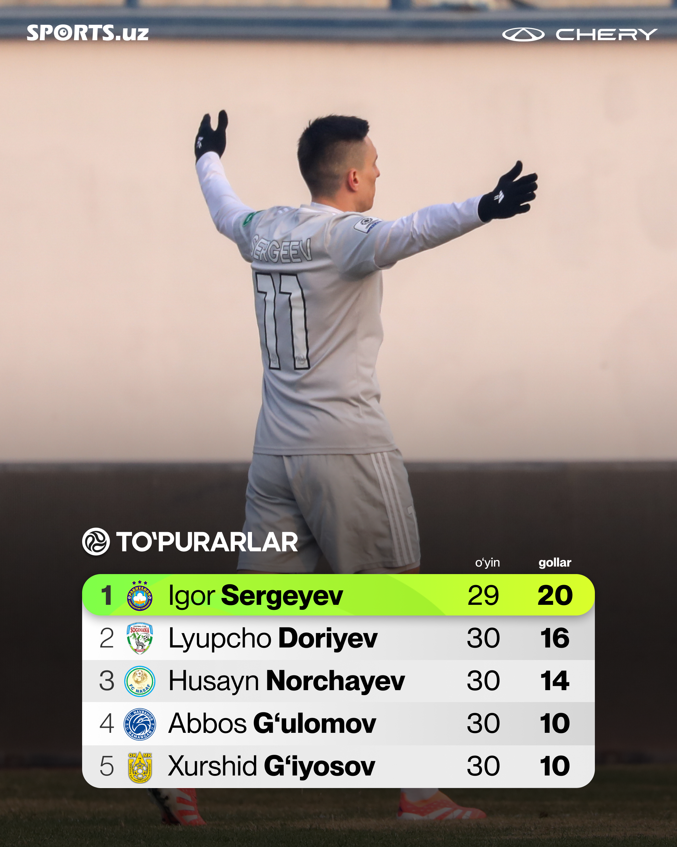 Yakunda "Paxtakor" futbolchisi Igor Sergeev 29 o‘yinda 20 ta gol urib, ushbu mukofotga sazovor bo‘ldi. Quyida mavsum yakuniy to‘purarlar ro‘yxati bilan tanishing.