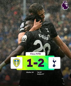 Англия чемпионати 7-туридан ўрин олган "Лидс" - "Тоттенхэм" баҳси меҳмонлар фойдасига 2:1 ҳисобида якунланди. "Шпорлар" сафида Матис Тель ва Муҳаммад Кудус гол урган бўлса, "Лидс" ҳужумчиси Ноа Окофор ўз исмини таблога ёздирди.