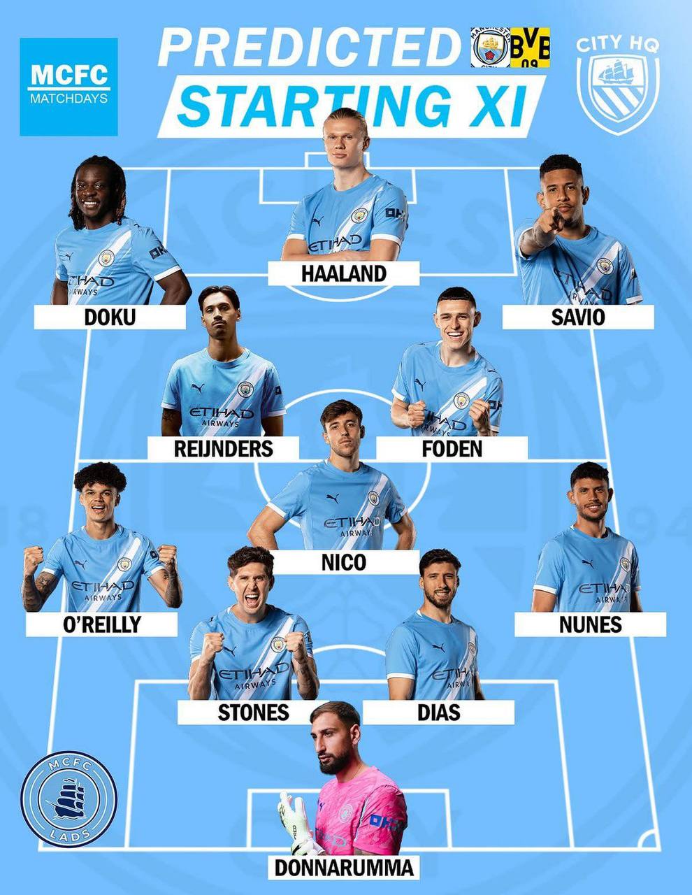 Доннарумма, Аит-Нури, Диаш, Гвардиол, Нунес, Родри, Доку, Фоден, Силва, Шерки, Холанд.