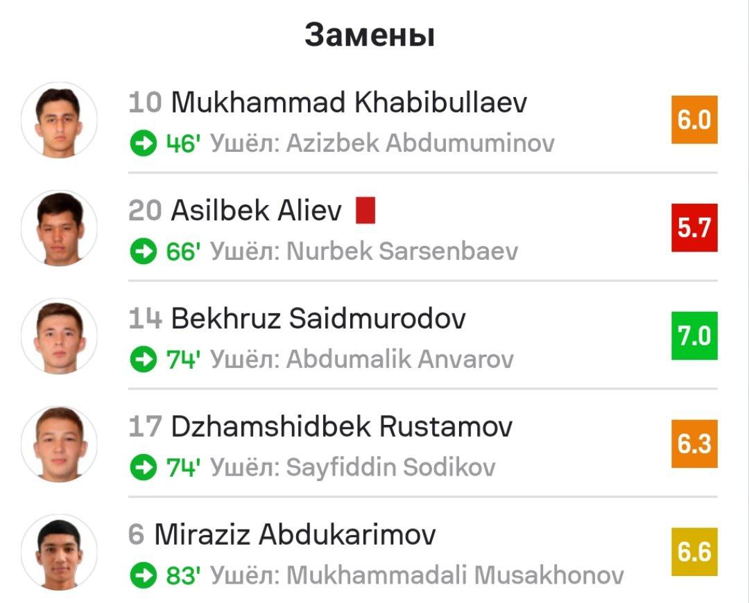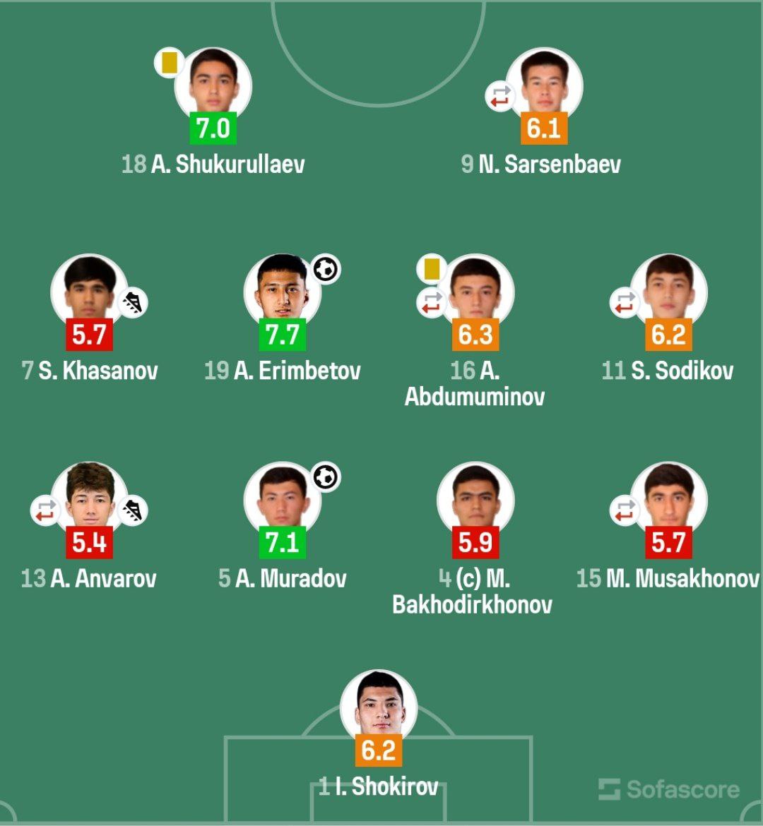 Sofascore версиясига кўра, терма жамоамиз таркибидан энг кўп баллни гол урган Азизбек Эримбетов қўлга киритди (7.7). Энг кам баллни эса чап қанот ҳимояда ҳаракат қилган Абдумалик Анваров олди (5.4).