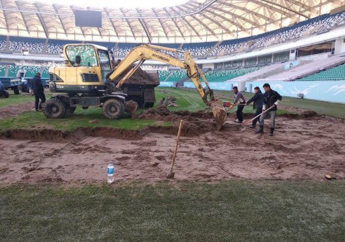 В данный момент работники убирают старый газон, и они должны быть предельно аккуратны в этом вопросе, чтобы не повредить дренажную систему. После этого освободившееся пространство заполняется специальным оборудованием, засыпается песком и плодородной почвенной смесью, а затем будет укладываться новый газон, заказанный из-за рубежа. Согласно международным стандартам, центр поля должен быть на 20 см выше краёв поля. Под руководством Шухратбека Суюнова мастера прикладываются все усилия, чтобы газон отвечал всем международным требованиям.