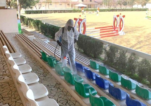 Процесс дезинфекции охватил все территории, от конюшен до арены, где проходят соревнования и зрительские секторы.