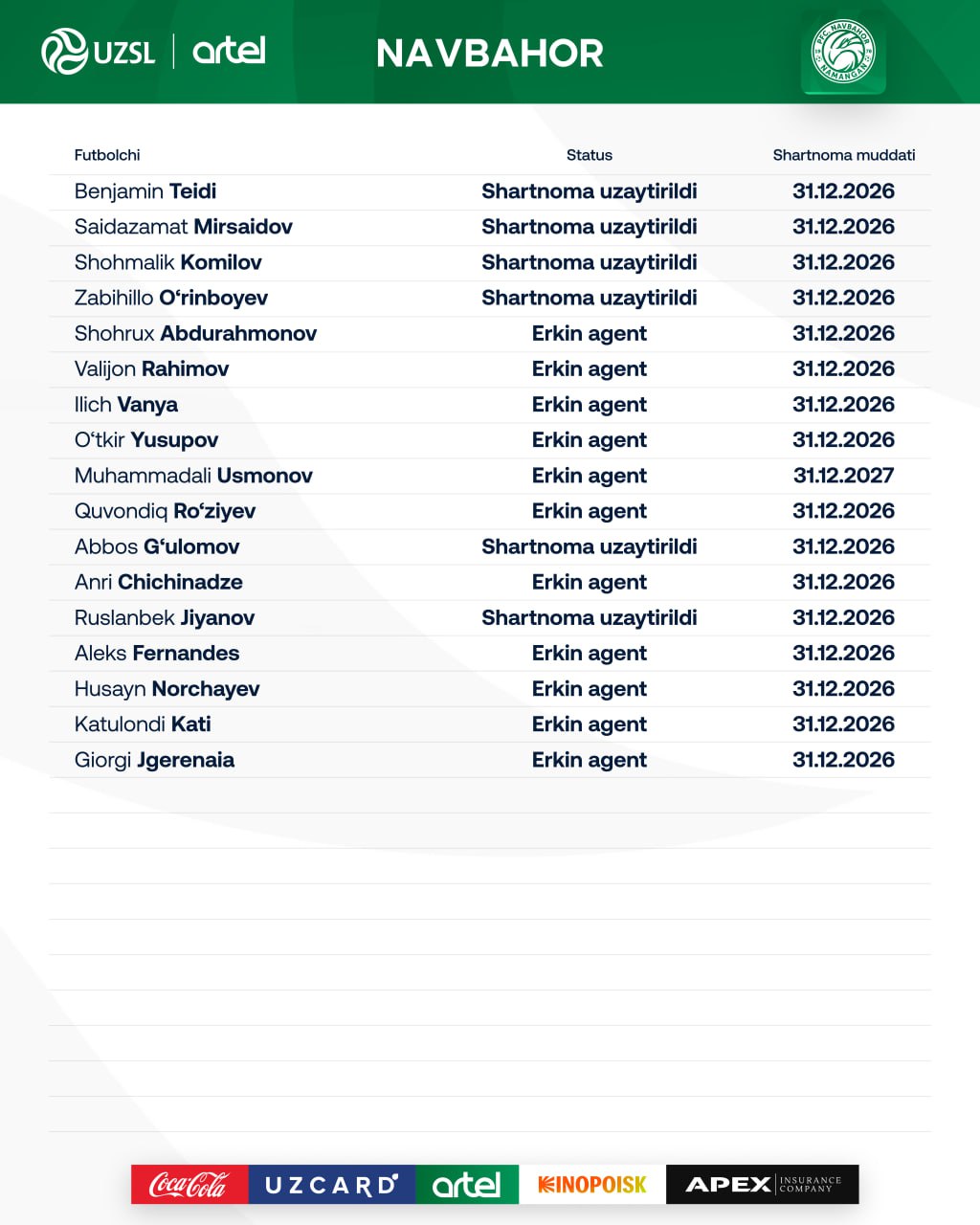 «Навбахор» зарегистрировал в Лиге 17 футболистом. Список опубликовала ПФЛ.