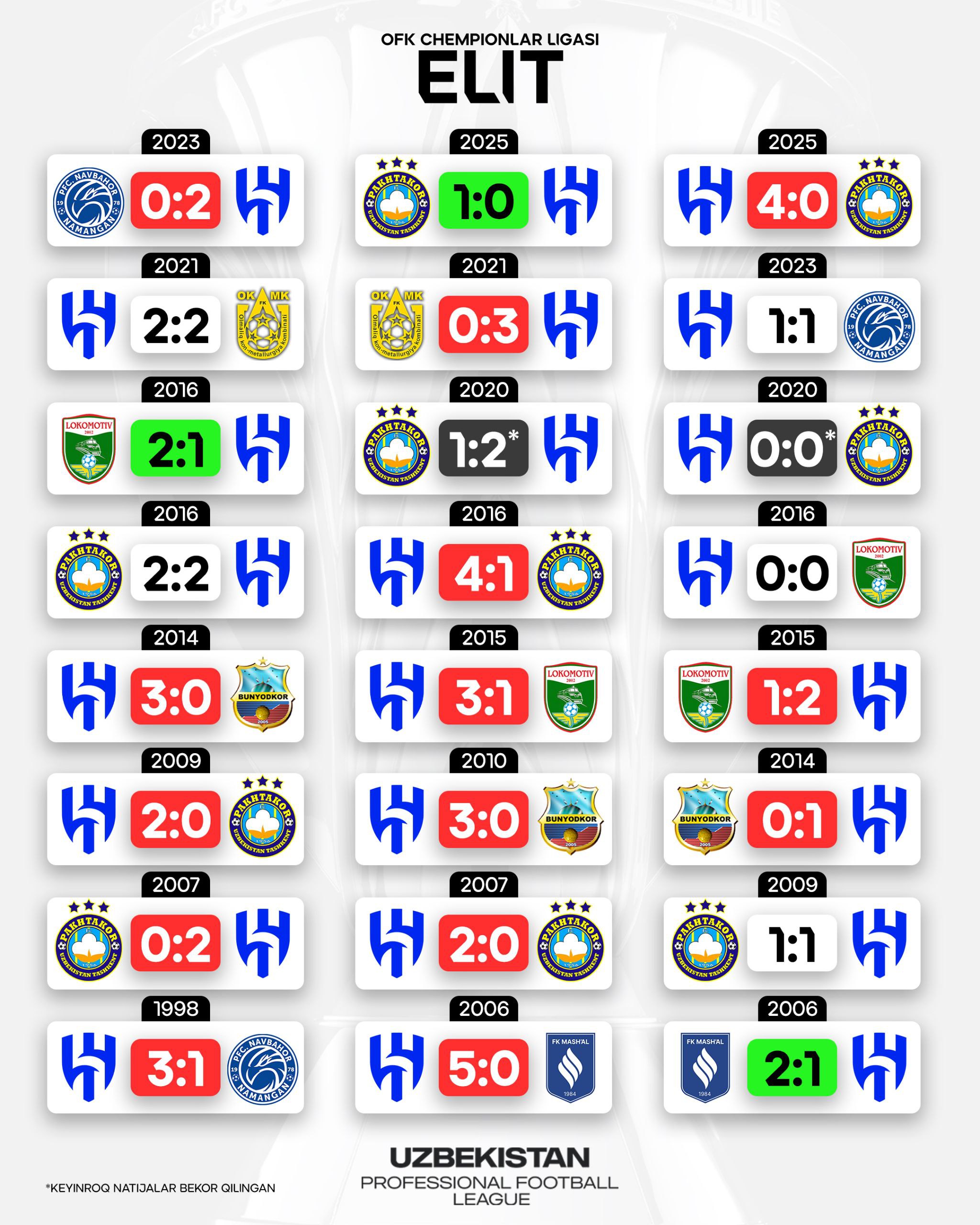 Эслатиб ўтамиз, 2020 йил бўлиб ўтган "Пахтакор" ва "Ал-Ҳилол" ўйини натижалари Саудия клуби мусобақадан четлатилгани сабаб бекор қилинган.