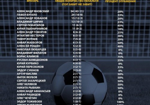 Павел Бугало из 24 пенальти отразил 8. У Анвара Жаббарова и Сергея Покатилова лучший процент отражения пенальти среди голкиперов, в чьи ворота было назначено более 5 пенальти. В 6 пенальти, назначенных в ворота Жаббарова было отбито 3. То есть процент отражения - 50%. У Покатилова из 11 пенальти было отражено 5. Его процент отражения составляет 45%.