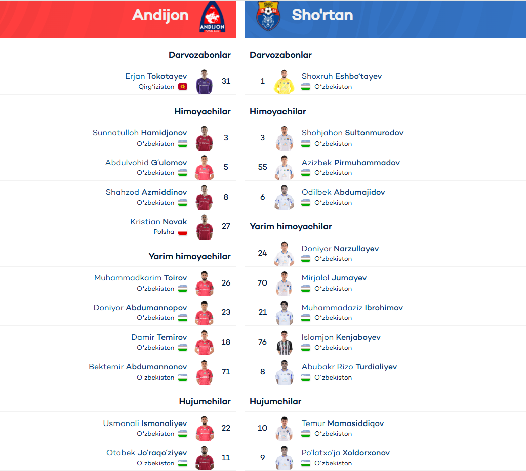 Стартовые составы на матч "Андижан" - "Шуртан"
