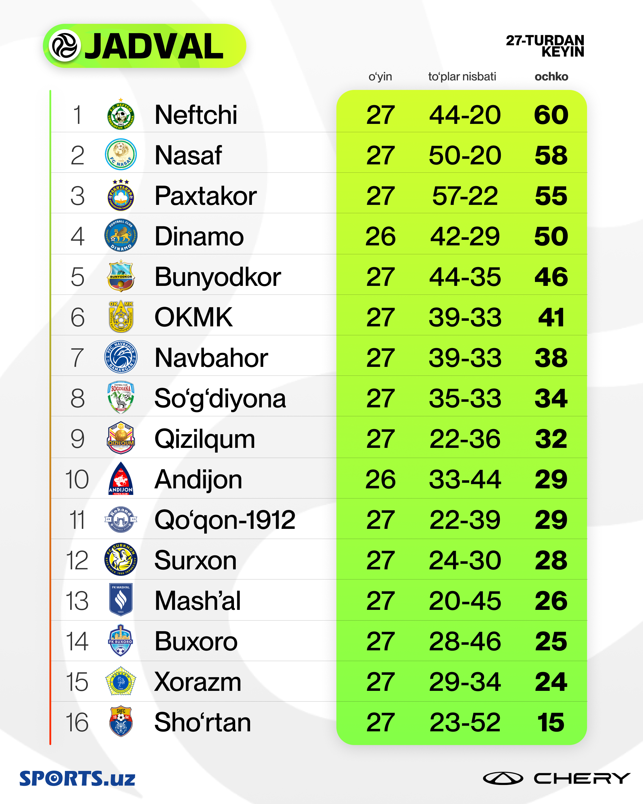 Суперлиганинг 27-тури ҳам якунланди. Турнир жадвали билан танишинг
