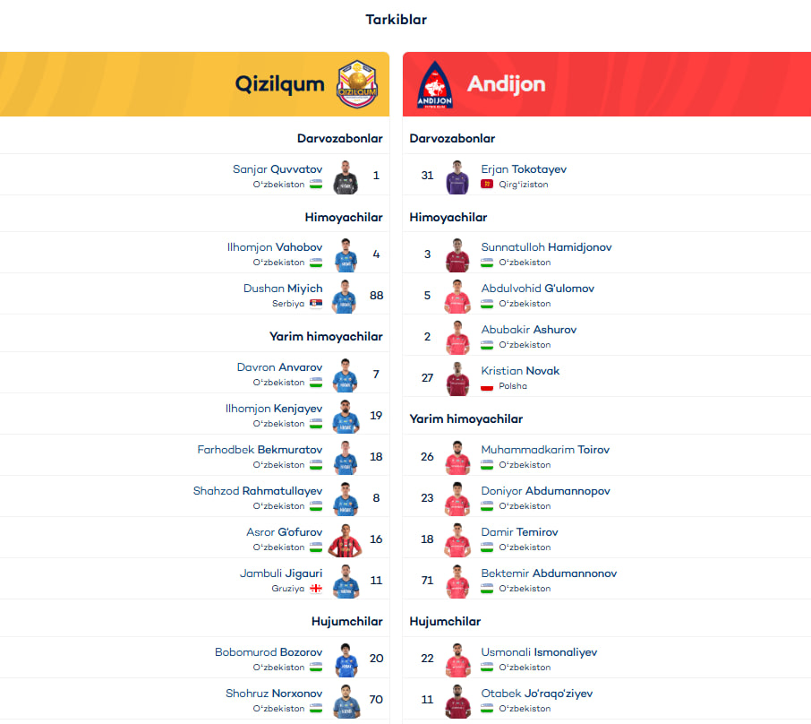 Суперлиганинг 28-тури доирасида "Қизилқум" ва "Андижон" жамоалари баҳс олиб боради. Бироздан сўнг бошланадиган учрашув учун икки клубнинг асосий таркиби билан танишинг.
