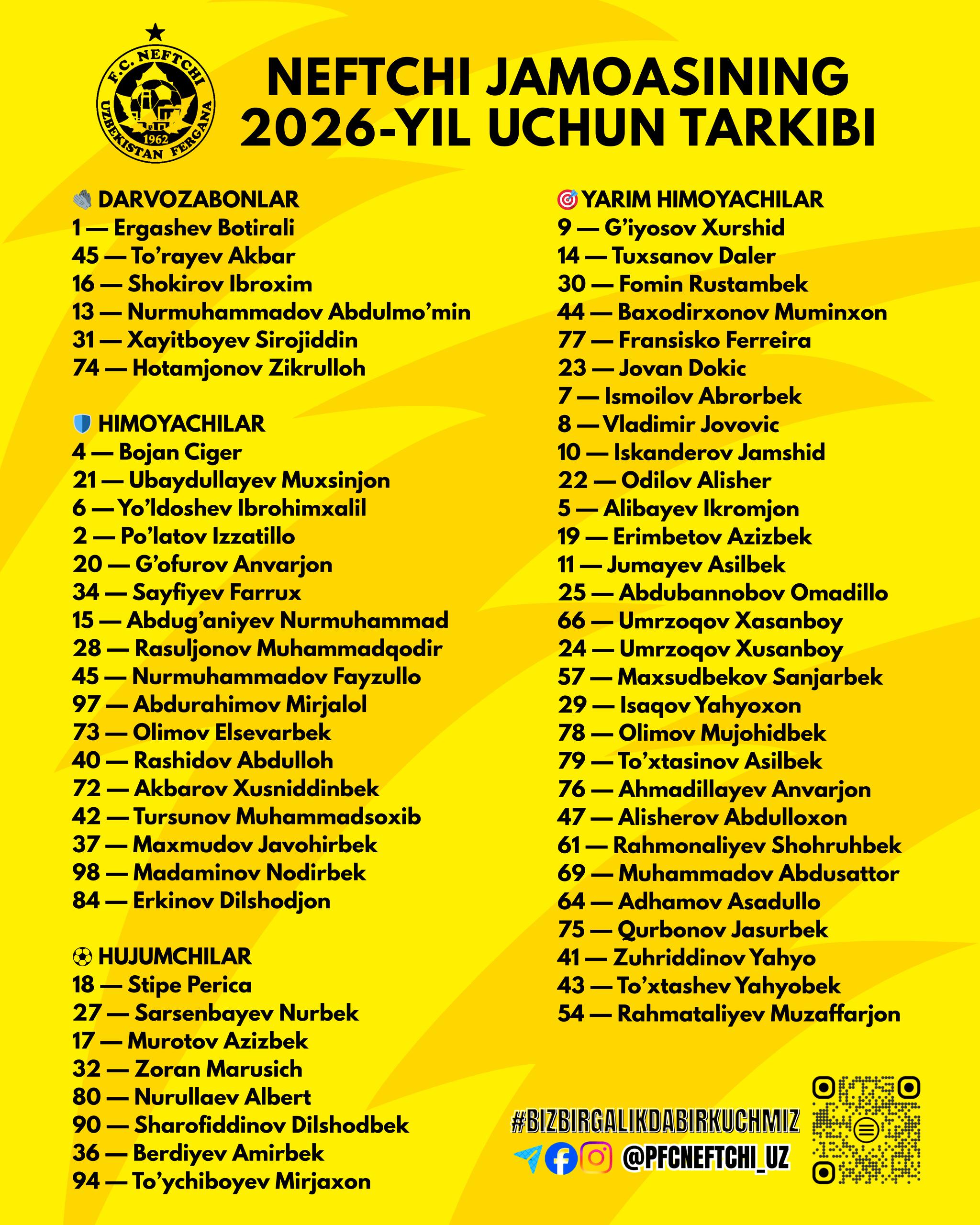 Ферганский «Нефтчи» зарегистрировал игроков в Лиге. Таким образом, в заявку вошли 6 вратарей, 17 защитников, 29 полузащитников и 8 нападающих.
